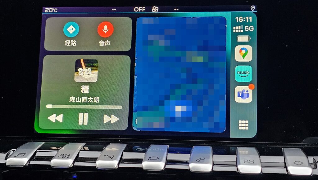 その後は普通に起動してくれました。実はCar Playを起動するのは初めてなのですが、画面レイアウトが半分で割られているので地図の部分が少なく、ちょっと使い方がもったいない気もします。