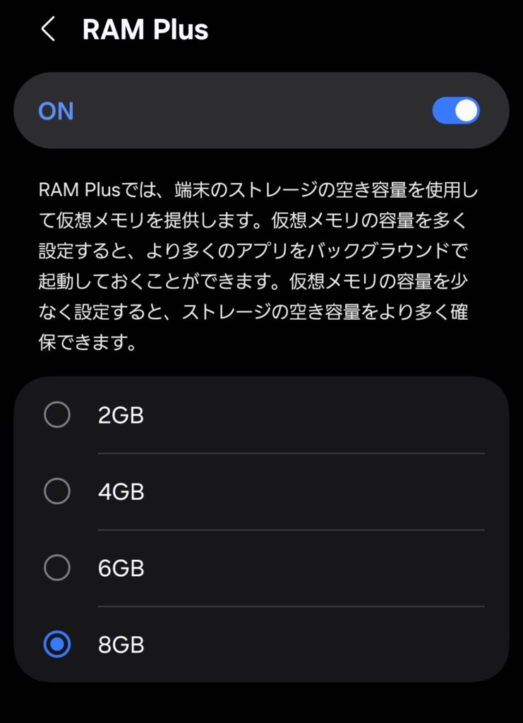 というわけで続いて「仮想メモリの設定をオン」にするやり方をトライです。仮想メモリは機種によって記載は違いますが、私のSamsung Galaxy S23 Ultraは「RAM Plus」という設定です。