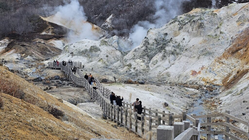 プロンプトは「この地獄谷から、日本の青鬼赤鬼たちが現れて、観光客が驚いて逃げていく動画を作成してください」です、